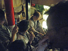 狭い空間にひしめき合うように囃子方が並び熱のこもった演奏を繰り返す。