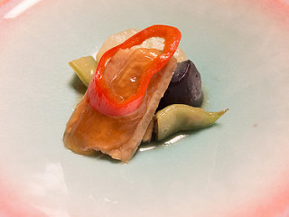先付けは穴子と加賀太胡瓜。懐紙に包まれた珍味は干し口子。