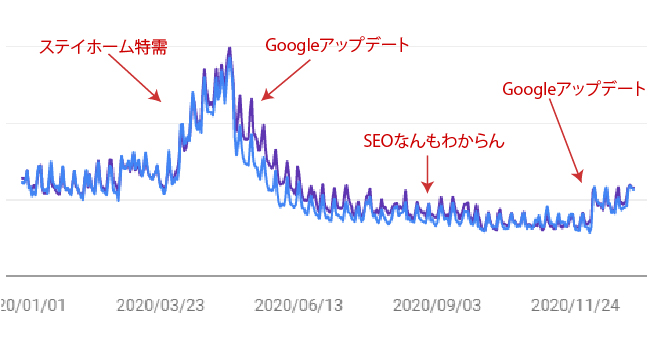 12月のアップデートでは、ある程度順位を戻したもののアクセス数は完全には戻らず。